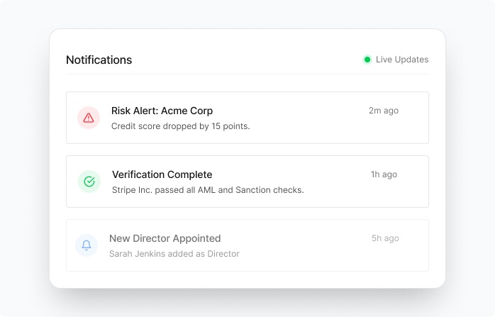 Stay in control with automated, ongoing monitoring. No manual tracking or platform hopping required. Your Watchlist operates 24/7 so every change in status, ownership, financial health or risk profile is flagged and delivered instantly.
