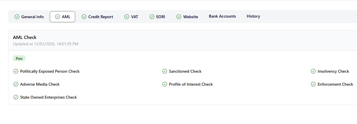 Once a new verification is submitted, the AML screening process is automatically initiated. As illustrated below, the system performs a series of critical compliance checks to determine whether the company meets regulatory requirements. The verification results include, but are not limited to, the following assessments:
