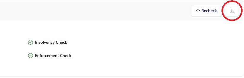 Within this section, users may either re-run the credit check by selecting the Recheck button located on the right-hand side, or view and download the full credit report using the Download button. The credit report is provided in .PDF format using the export button.