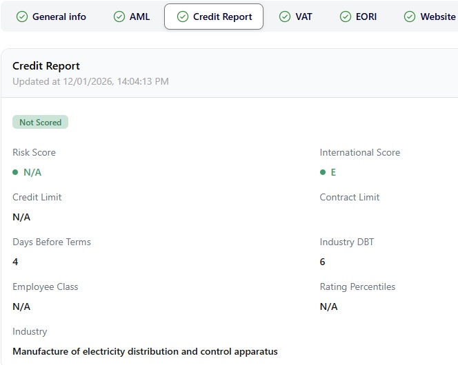 The Credit Report is automatically generated upon the successful registration of a new company verification. The exact date and time of the report generation are displayed beneath the Credit Report tab title.