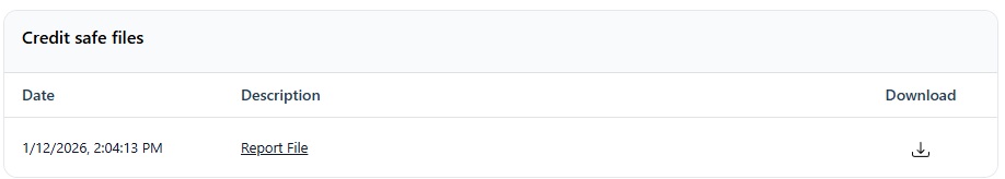 Additionally, a section below displays any available Creditsafe source files, where applicable. For each file, the corresponding retrieval date and time are shown on the left-hand side. Users may download these files by selecting the Download button located on the right.