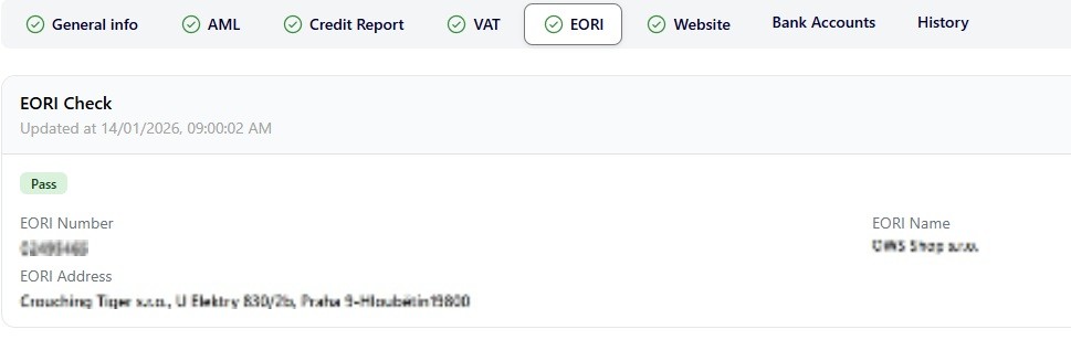 The EORI Check is automatically initiated upon the successful registration of a new company verification. As illustrated below, this section allows users to review the EORI validation results, including the following information: