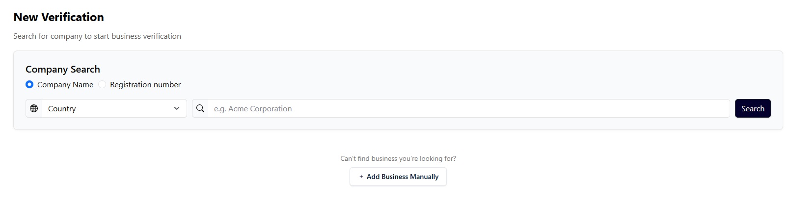Within this section, you may add a company for verification by entering either the company name or the company number. The option to perform a verification using the VAT number is demonstrated separately in the image below for clarity.