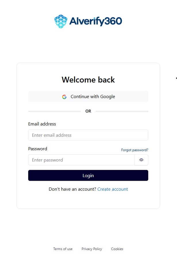 To create an account, please navigate to app.verify360.ai and register using a valid email address and password, or alternatively, select “Continue with Google” to sign up using your Google account.